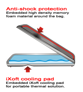 iXoft Bag can be placed on desk or on the lap. It can be use virtually at anywhere. When placing notebook on the lap, iXoft helps to neutralize heat coming from notebook.